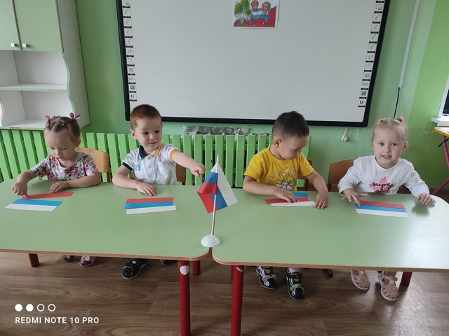 мы поговорили с детьми о нашейстране - России, рассказали детям, что в каждой стране есть свойфлаг. Рассмотрели все цвета и рассказали о значении каждого из них.