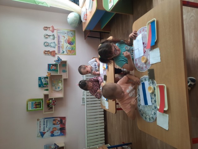 мы поговорили с детьми о нашейстране - России, рассказали детям, что в каждой стране есть свойфлаг. Рассмотрели все цвета и рассказали о значении каждого из них.
