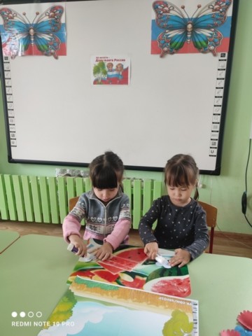 Для закрепления знаний офлаге нашей страны поиграли в Д/и "Выложифлаг», сделали аппликацию -"Флаг России".